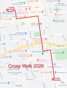 As we did for the last several years, the Cross Walk will start at LOAVES & FISHES, 657 West 5th Street, the Building across the street from the Downtown Library. Parking is available in the Centenary UMC lot next to Loaves & Fishes, and we will gather in the 5th Street “Gathering Place,” the open lot between Loaves & Fishes and ALV Nightclub. Please arrive between 10:30 am and 11:00 am. The Walk will begin at 11:00 promptly. The route (below) is a little over 1 mile in length. We have arranged to use bathrooms at Centenary UMC prior to the Walk, since the library is closed on Good Friday. We walk slowly so that the walk will take 40 minutes or more. We conclude at Salem Square, where Walkers will be greeted by a Moravian Band, and together we will join in a Good Friday Liturgy of Confession.